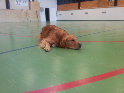 Fellesdekk: Trege neddekk, hører litt på naboens kommandering på dekk og sitt opp, men ligger rolig og fint. Hadde på første økta behov for å slikke litt på golvet og litt på labbene.